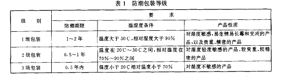 ①包裝的防潮等級應根據(jù)產(chǎn)品的性質(zhì)、流通環(huán)境、儲運時間、包裝容器的一般性能等因素來確定防潮包裝等級分為1級包裝、2級包裝、3級包裝,詳見表1。
